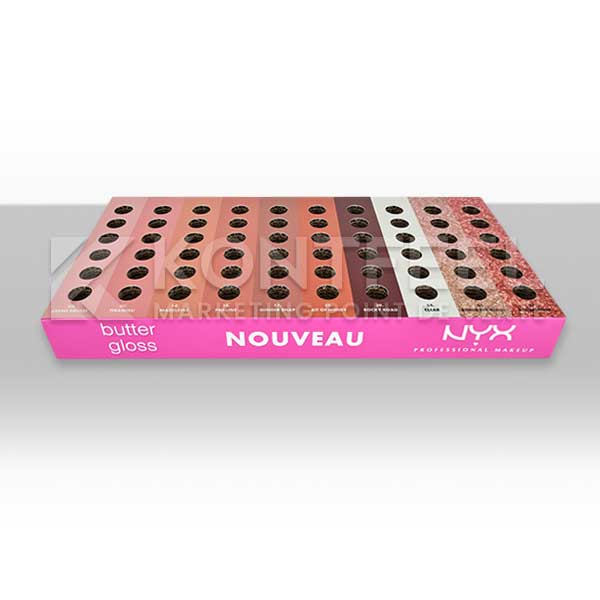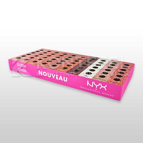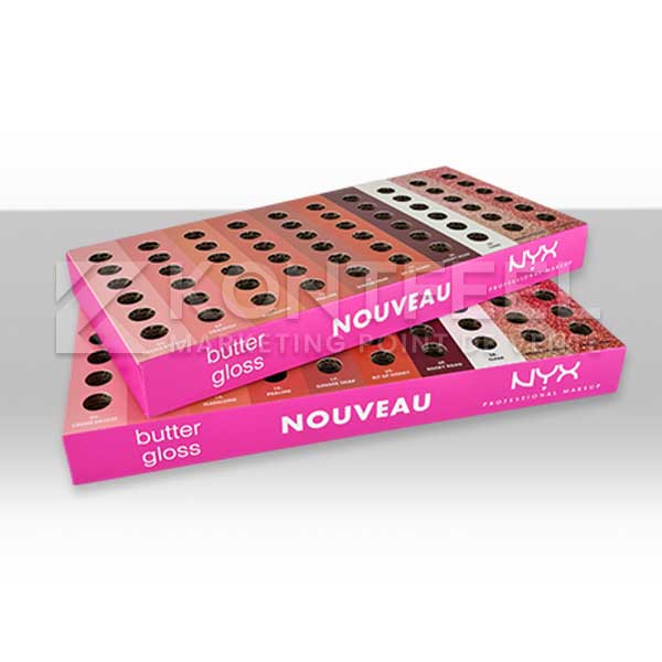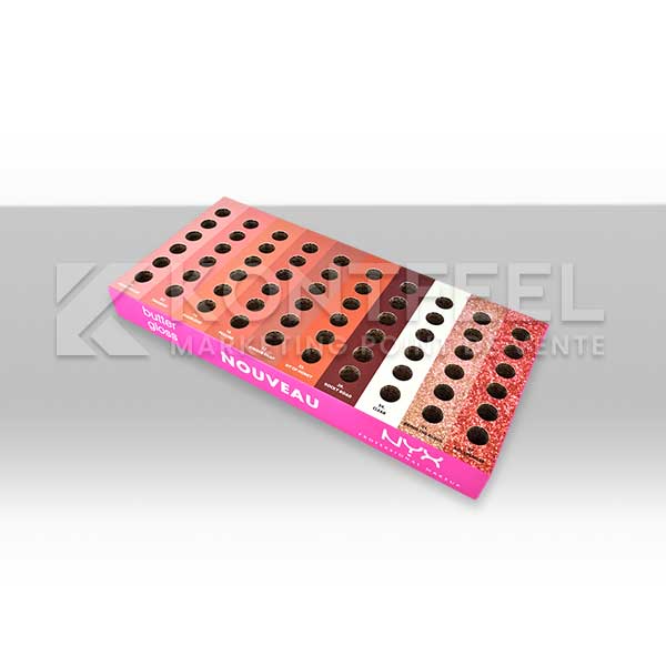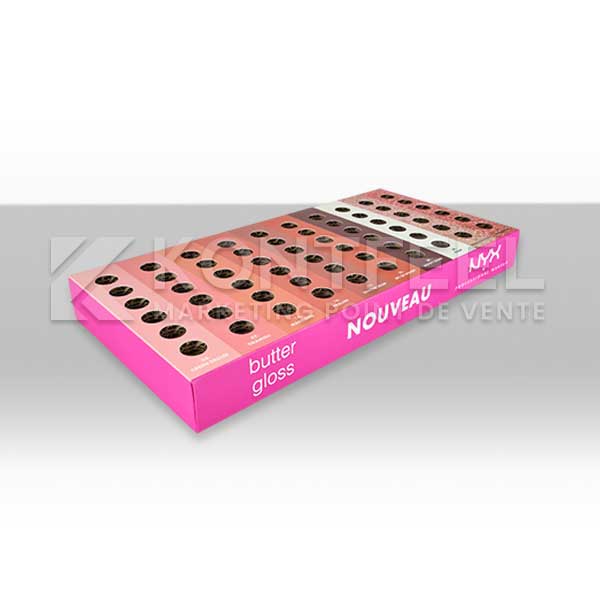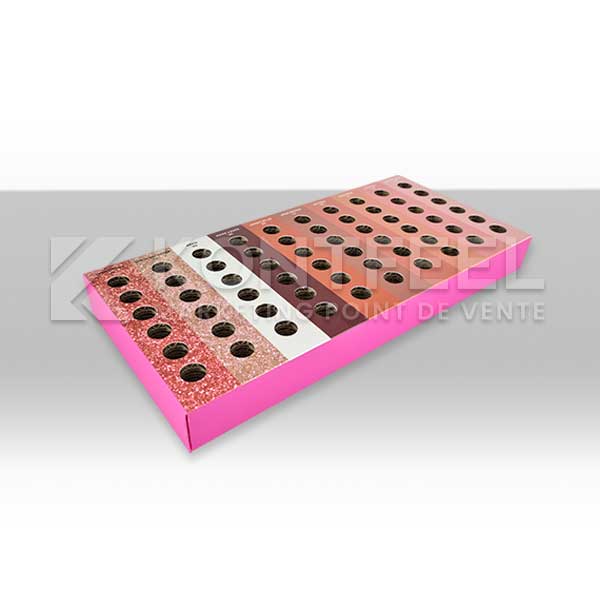 Tags : plv maquillage, plv carton beauté, présentoir cosmétique, barquette à trous, plv produits beauté, conception plv sur mesure