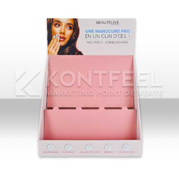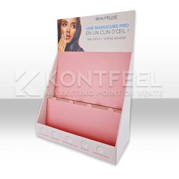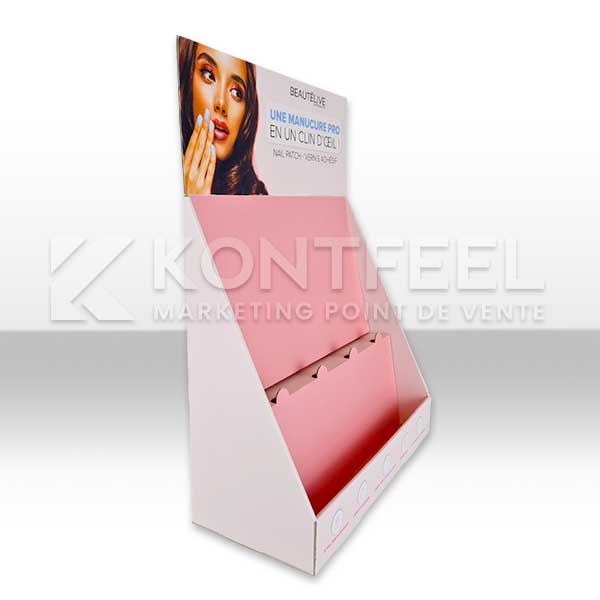 Tags : présentoir escalier beauté, PLV beauté, présentoir cosmétique, support PLV sur mesure, carton rigide