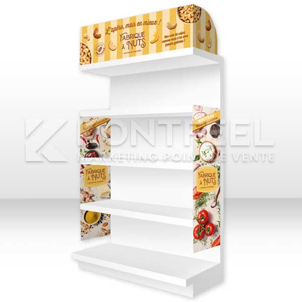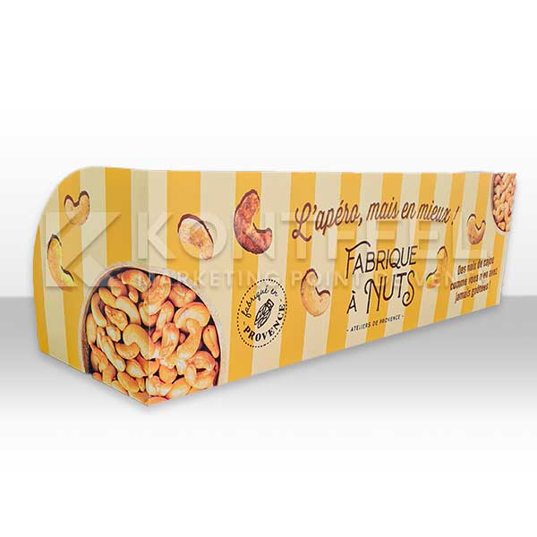 Tags : fronton TG, tête de gondole, joue de TG, conception carton sur mesure, animation linéaire, GMS
