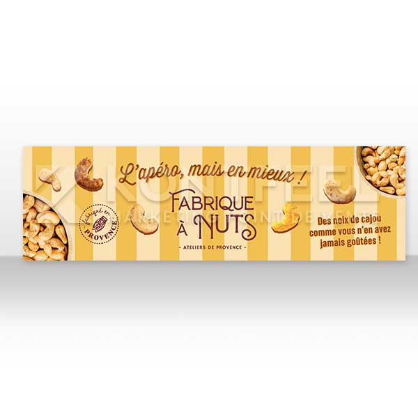 Le fronton TG pour tête de gondole est une solution de PLV carton sur mesure idéale pour renforcer la visibilité de vos produits en GMS. Placé en haut ou sur les côtés du meuble, il attire immédiatement l’attention des consommateurs et valorise vos animations linéaires ou opérations promotionnelles.