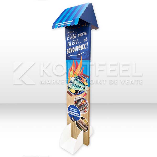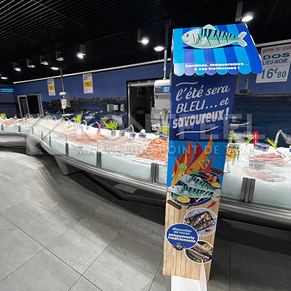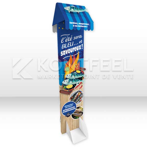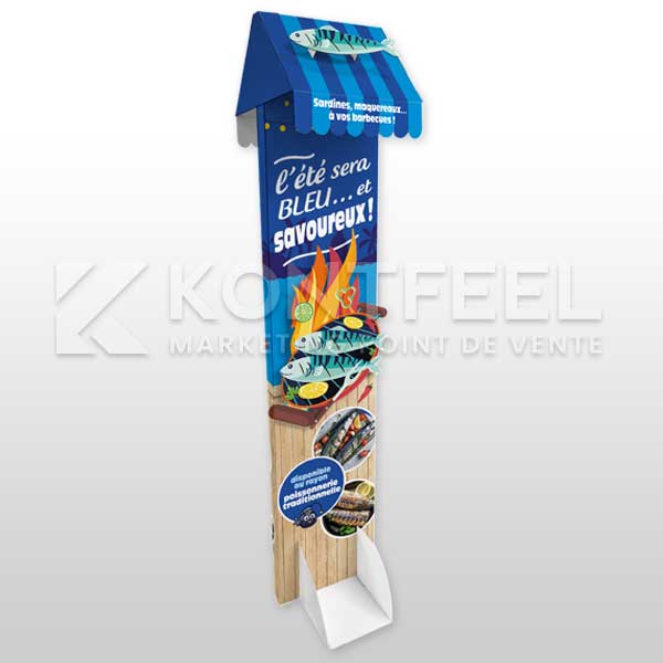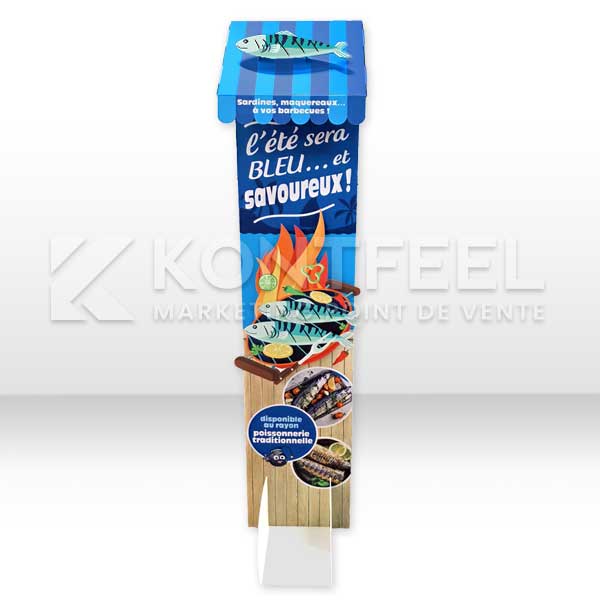 La PLV sous forme de totem est destiné au rayon poissonnerie. La mise en avant des produits de la mer est recherché par l'emploi d'un support en carton 100% personnalisée, spécialement conçue pour les rayons marée service. Ce totem original à l’esthétique estivale capte immédiatement l’attention des consommateurs et valorise les promotions saisonnières.
