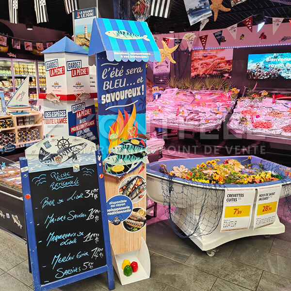Astuce : Ce type de PLV totem offre une communication optimisé grâce à une découpe personnalisée et des décors en relief garantissant la visibilité des produits de la mer. Facile à monter, écologique et esthétique, elle constitue un outil marketing efficace pour dynamiser les ventes durant la période estivale en dehors du linéaire traditionnel.